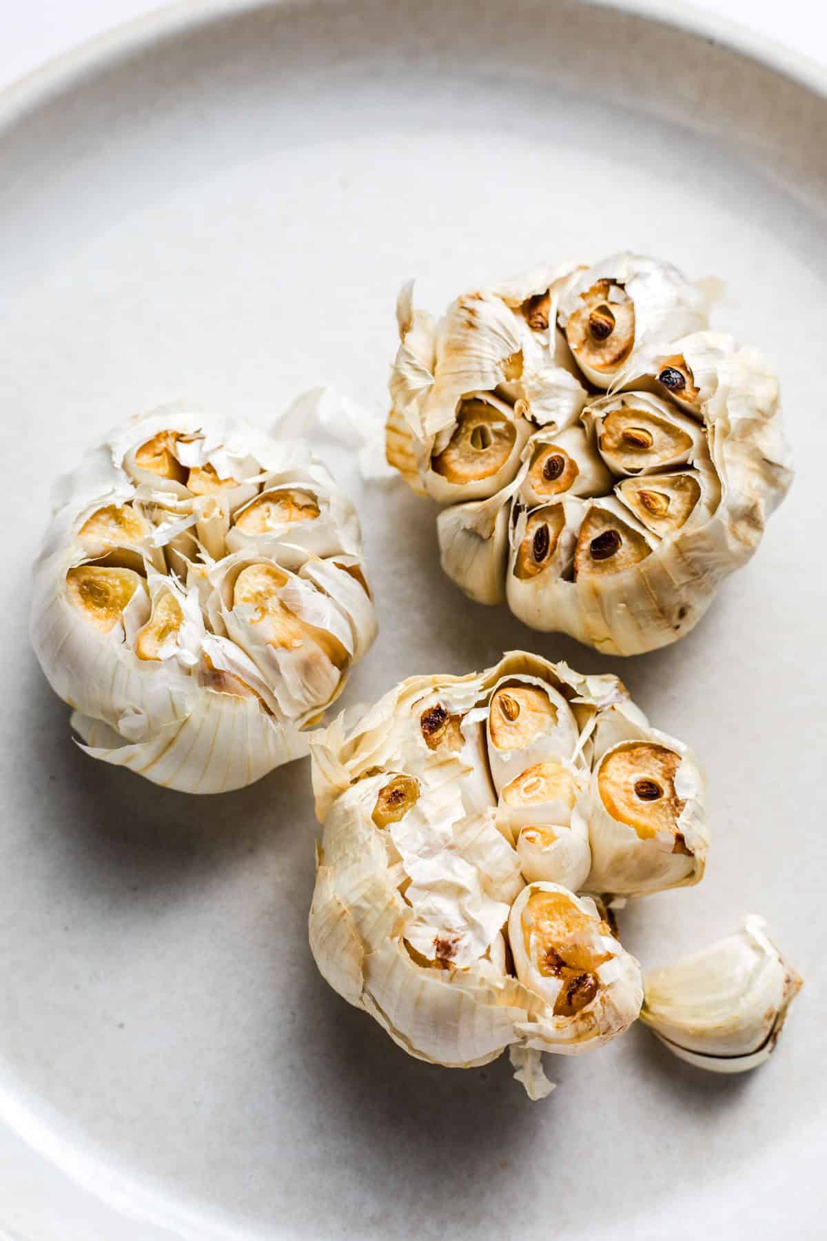Pro Knolle erhält man nach dem Rösten ca. 10–15 weiche Zehen. Ich empfehle 2–3 Knollen gleichzeitig zu rösten, die fertige Knoblauchpaste hält sich ein paar Tage und du kannst sie auch portionsweise einfrieren.
