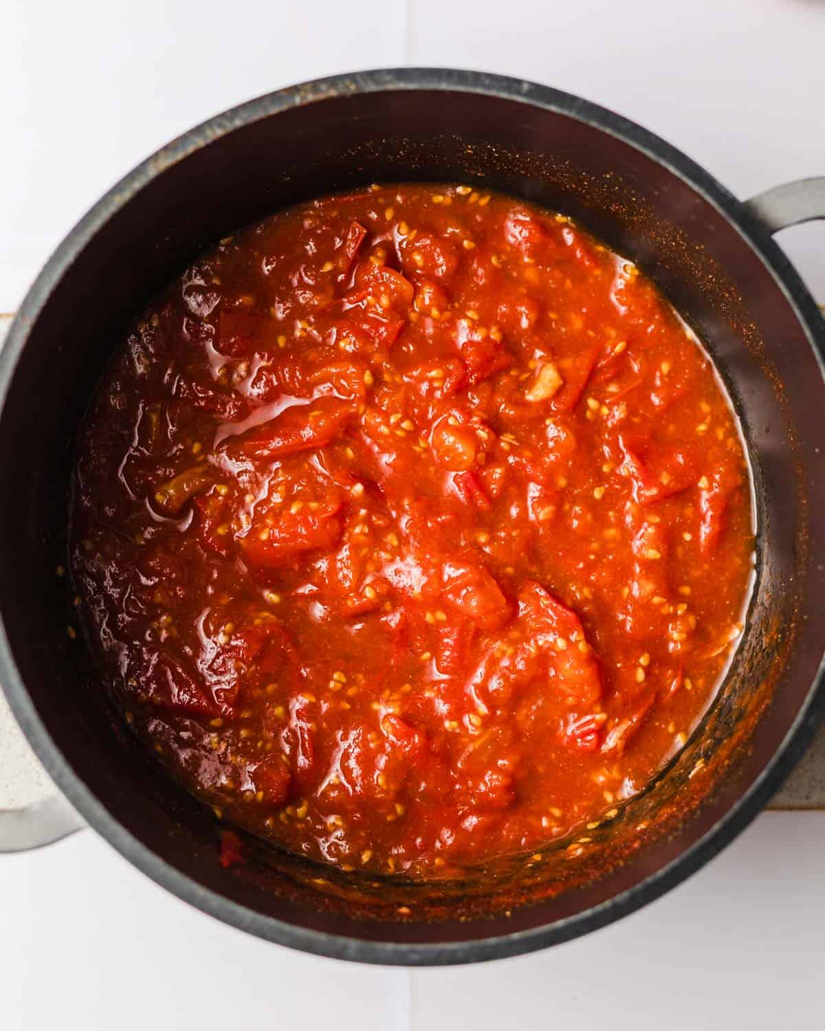 - Die Gewürze einrühren und weitere 15 Minuten ohne Deckel köcheln lassen. Zwischendurch umrühren und die Tomaten dabei ggf. etwas zerdrücken.