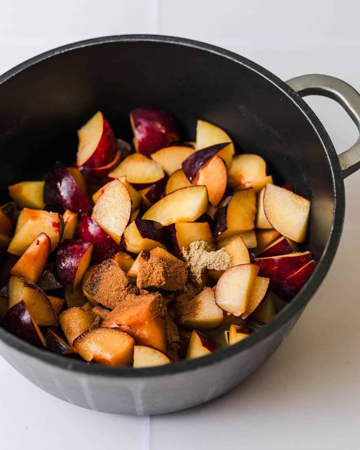 - Schritt 1: Pflaumen in kleine Stücke schneiden und mit den restlichen Zutaten in einen Topf geben.