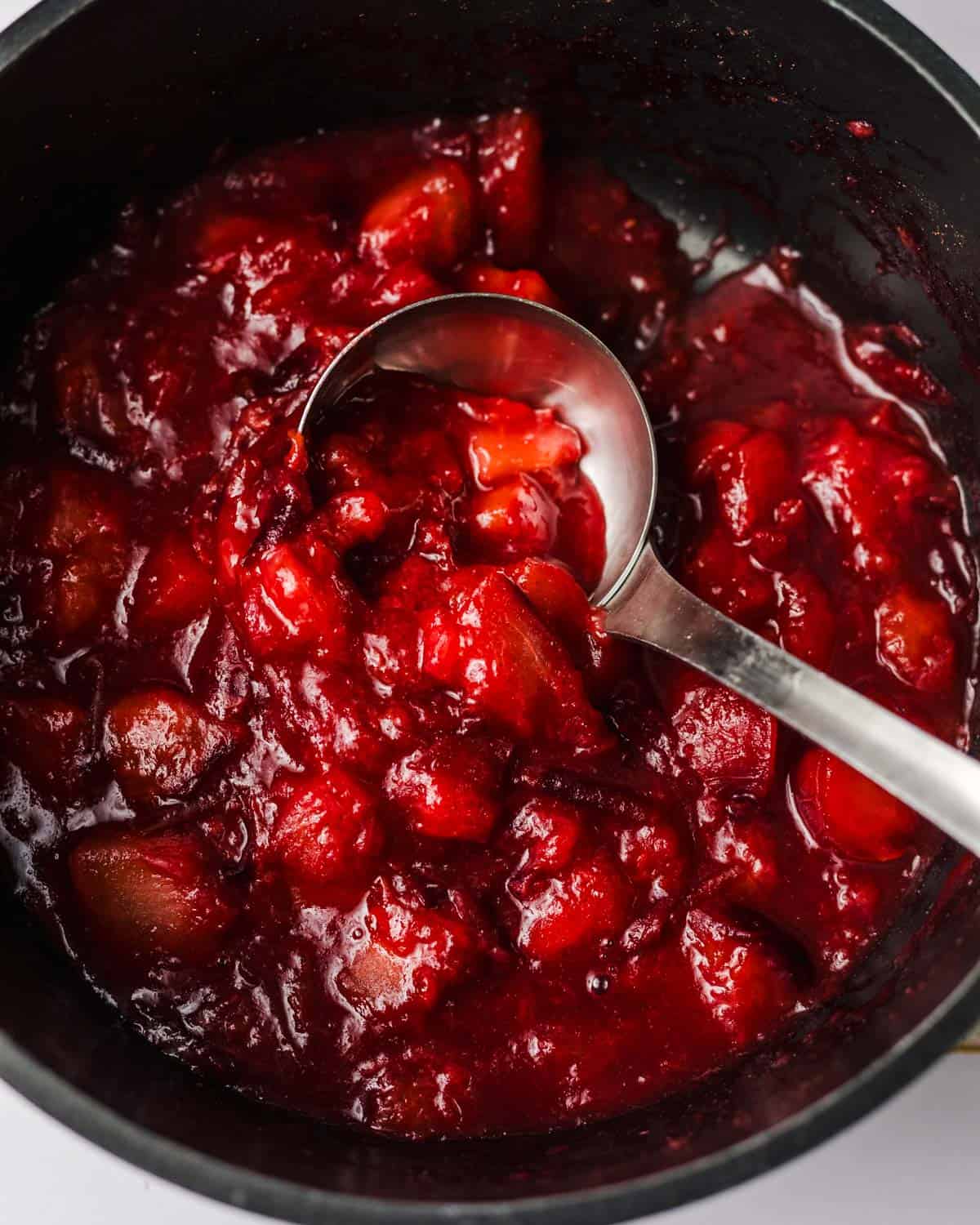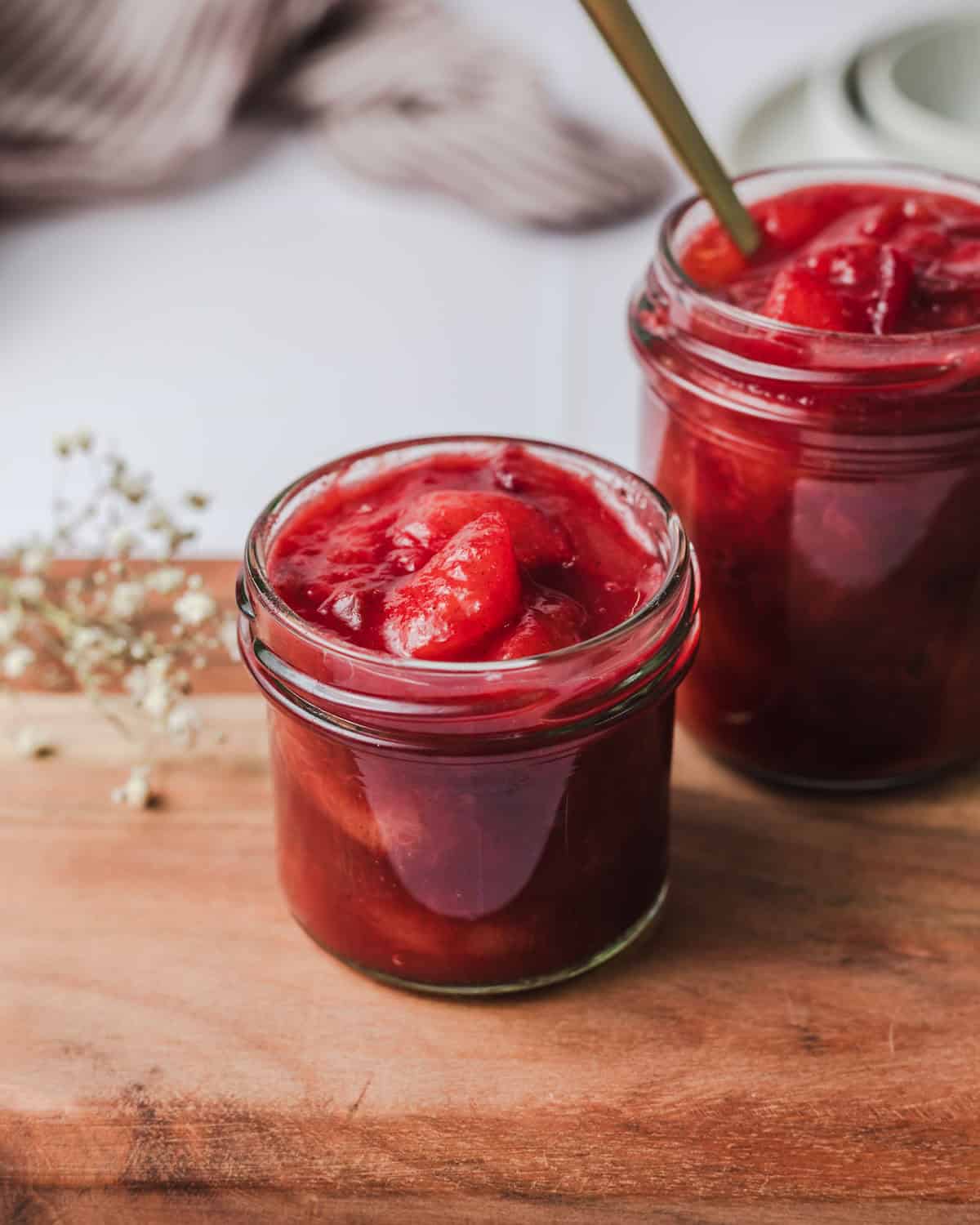 Das kommt auf die Wahl der Früchte an. Pflaumen enthalten von Natur aus reichlich Pektin (ein Ballaststoff, der auch in klassischen Gelierzuckern steckt). Beim Erhitzen sorgt es dafür, dass das Kompott ohne Gelierzucker eindickt. Eine passende Alternative sind Äpfel und Johannisbeeren, welche auch geschmacklich eine gute Kombi mit den Gewürzen ergeben.