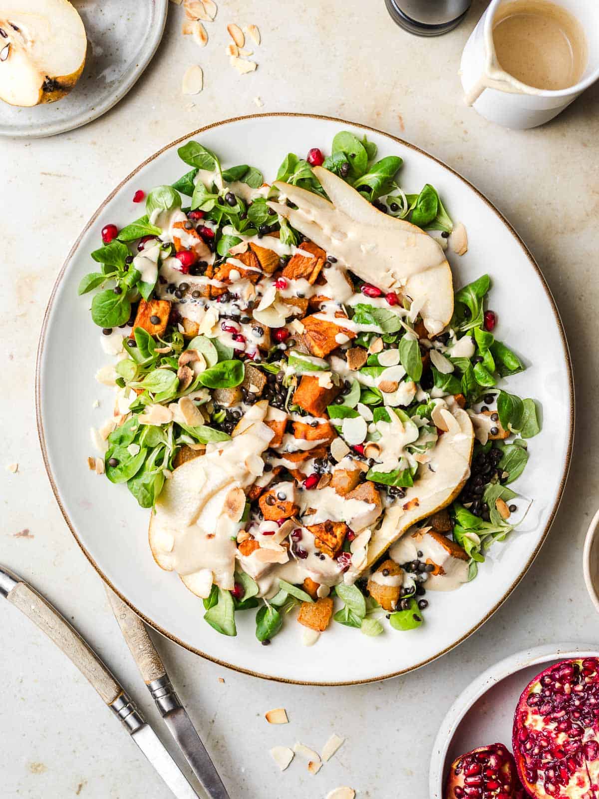 - Salat anrichten: Feldsalat, Linsen, Ofengemüse, Birnenstücke, Mandeln und Granatapfelkerne in eine große Schüssel oder auf einen großen Teller geben. Mit dem Dressing beträufeln und vorsichtig vermengen.